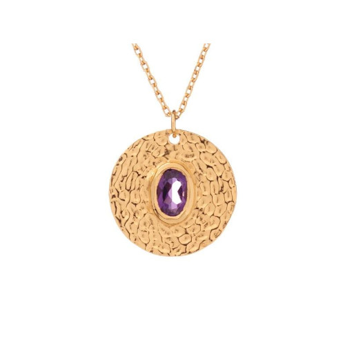 This 925/1000 gold plated silver necklace, adorned with a purple amethyst of African origin, stands out for its refined design and hammered finish. Its adjustable length of 42 to 45 cm allows a perfect adaptation to different outfits and occasions, thus offering great flexibility for your end customers.