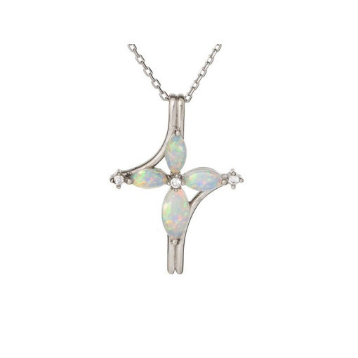 This 925/1000 rhodium-plated silver cross pendant stands out for its elegant and refined design. The main natural stone, a natural Australian navette-shaped opal, is set with prongs and accompanied by zirconium oxides, offering a subtle and sophisticated sparkle. The polished finish of the silver adds a touch of shine, making this jewel a perfect choice for customers looking for both style and quality.