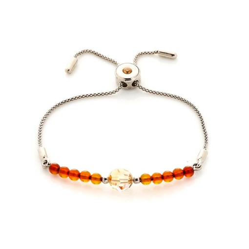 This 925/1000 rhodium-plated silver bracelet combines the timeless elegance of Baltic amber with the sophisticated brilliance of Swarovski crystals. The ball shape of the cognac-coloured amber adds a touch of warmth and refinement, while the adjustable sliding clasp ensures a perfect fit for every customer. This versatile design adapts to a variety of occasions, making this jewellery an ideal choice for retailers looking to offer pieces that are both elegant and functional.