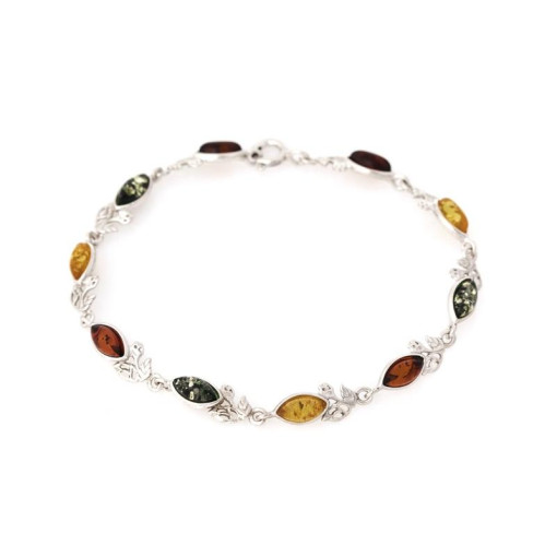 Ce bracelet en argent rhodié 925/1000 se distingue par son design sophistiqué, mettant en valeur des pierres d'ambres en forme de navette. Avec une longueur de 18 cm, ce bijou est conçu pour apporter une touche d'élégance à toute tenue féminine, attirant ainsi une clientèle soucieuse de l'esthétique et de la qualité.